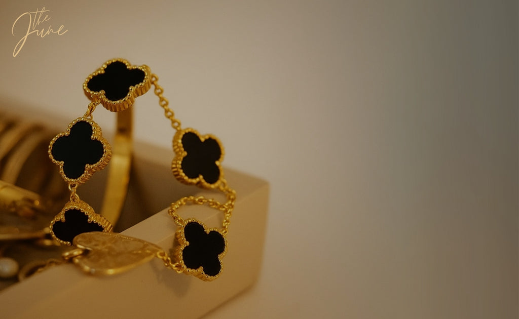 Dark elegance meets everyday luck. The Midnight Bloom Bracelet from TheJune features rich black enamel four-leaf clovers, delicately framed in soft gold — each one symbolizing hope, love, faith, and fortune. Reimagined with a sleek,...