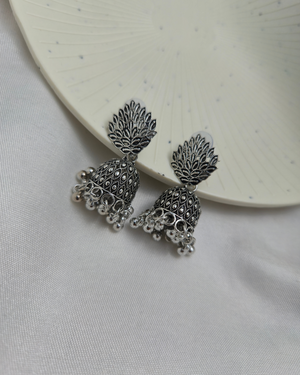 A piece that echoes heritage with modern grace – the SilverLeaf Jhumkas are made for the woman who blooms in her own style.