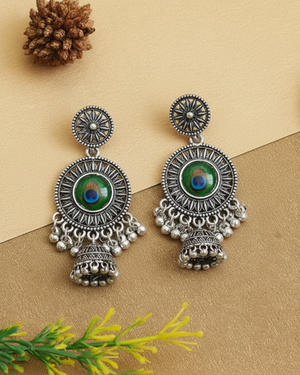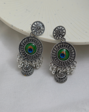 Celebrate the spirit of tradition with the Mohana Peacock Charm Jhumka. At its heart lies the vibrant peacock feather motif — a symbol of beauty, pride, and festivity — framed in intricate oxidised silver detailing. Dangling ghungroo accents and a miniature dome jhumka add movement and grace, making every step feel like a dance.