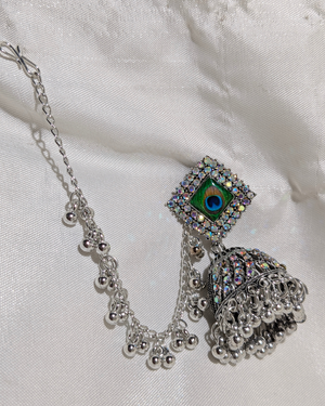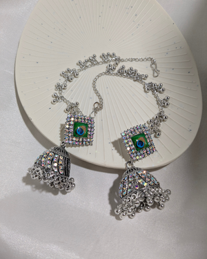 A modern twist on a timeless tradition. Introducing the June's Mayuri Cascade Jhumkas. These breathtaking oxidized earrings feature a bold square stud with a vibrant peacock eye, leading to a classic jhumka bell. What makes them truly unique is the elegant side chain that cascades down, adorned with delicate ghungroo beads for a touch of mesmerizing charm.